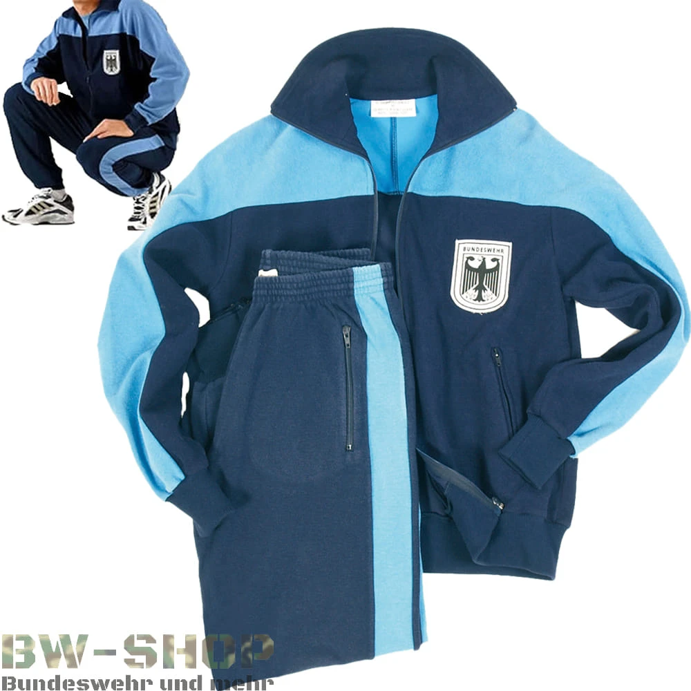 Der Original Bundeswehr Sportanzug bestehend aus der Trainingshose und der Trainingsjacke eignet sich perfekt für sportliche Aktivitäten wie Joggen, Fahrrad fahren, Fitnesstraining, Leichtathletik, Laufen und vieles mehr. Die Jogginghose ziert jeweils ein hellblauer Streifen pro Bein. Auf der Jacke ist das Emblem der Bundeswehr mit dem Adler auf der linken Brustseite angebracht.