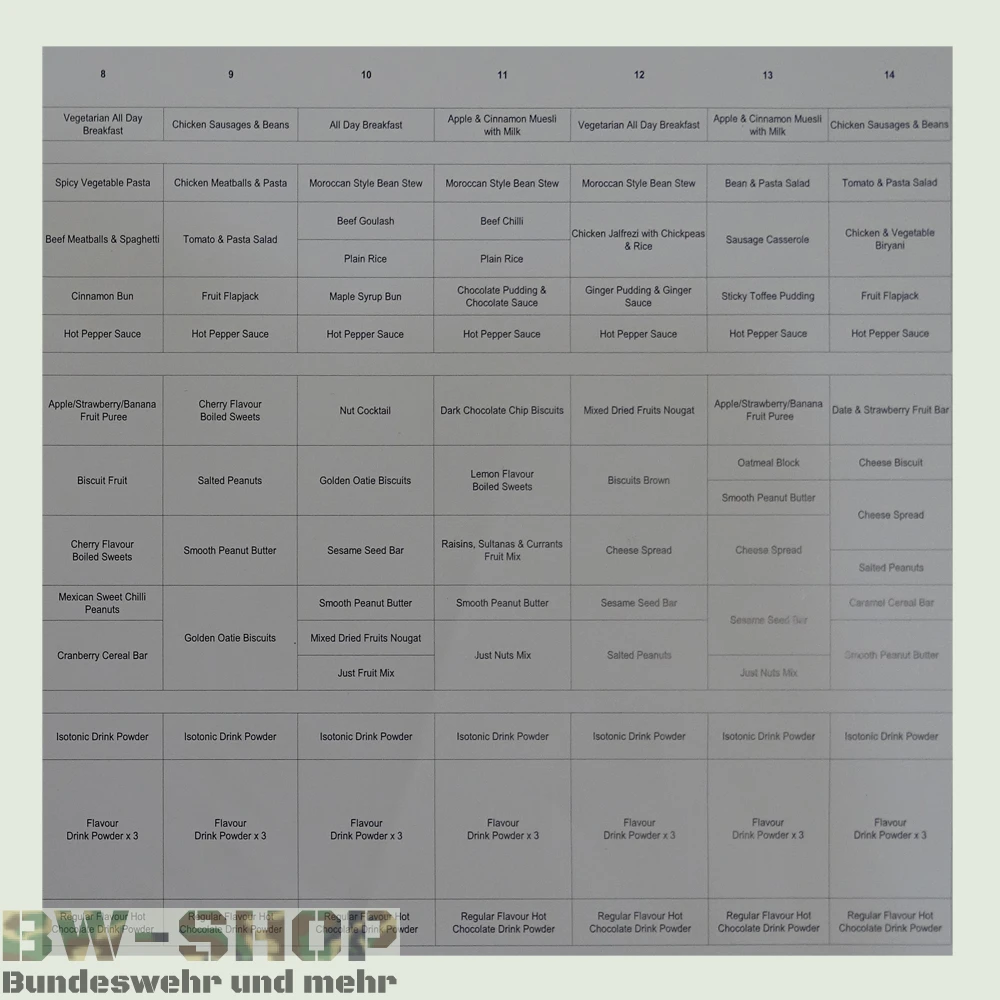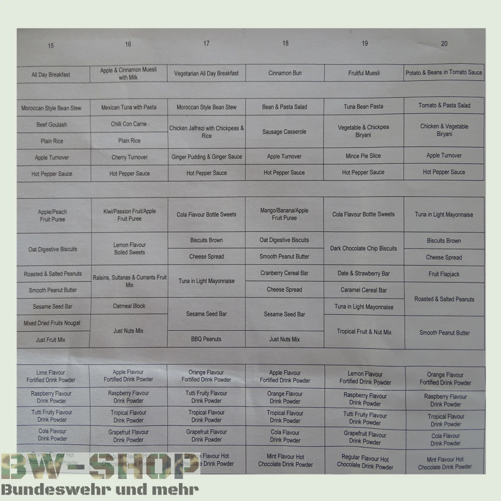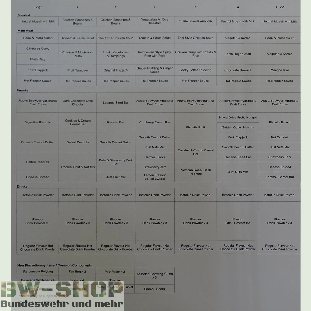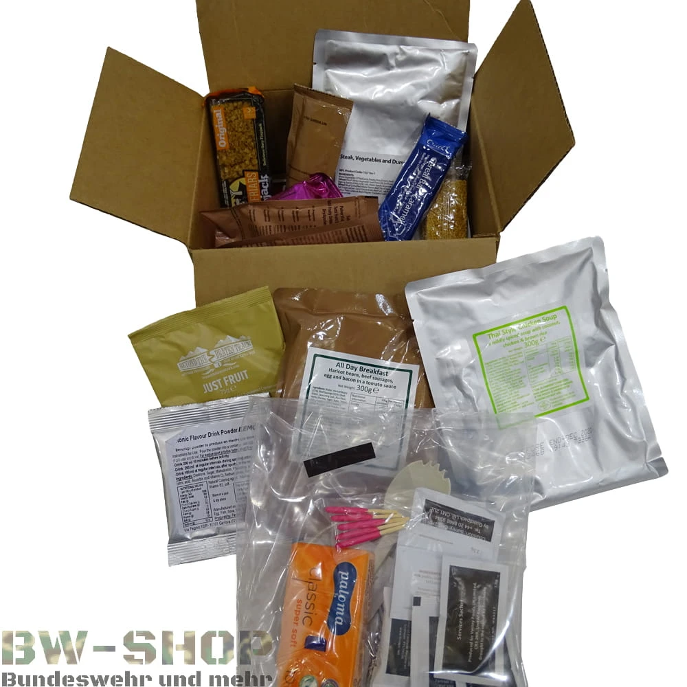 Essensrationen (Einmannpackungen) der Britischen Armee für das Überleben im Freien. Mit diesen Rationen haben Sie ein All-in-One Paket, das zum Überleben nötig ist. Nähere Informationen über die einzelnen Bestandteile einer Ration finden Sie in der Artikelbeschreibung und im Bild.