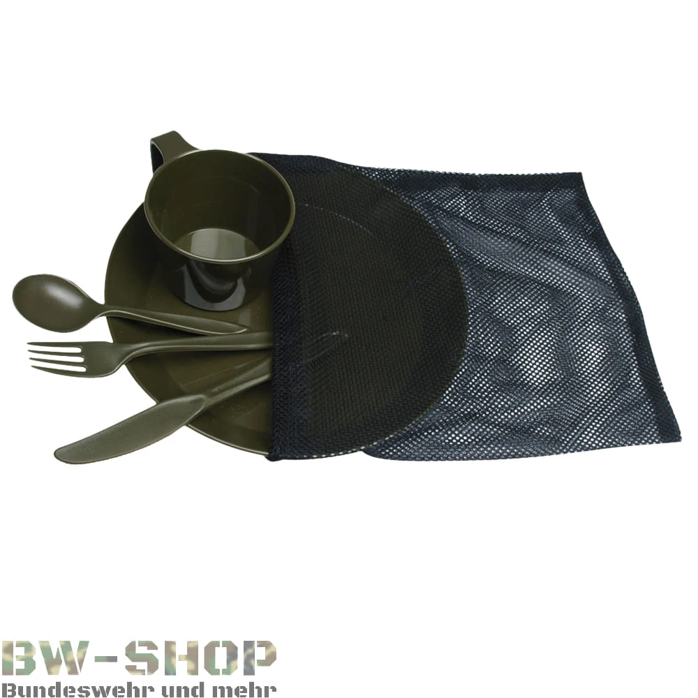 - 5-teiliges Camping Geschirr Set bestehend aus Teller, Tasse, Löffel, Messer und Gabel