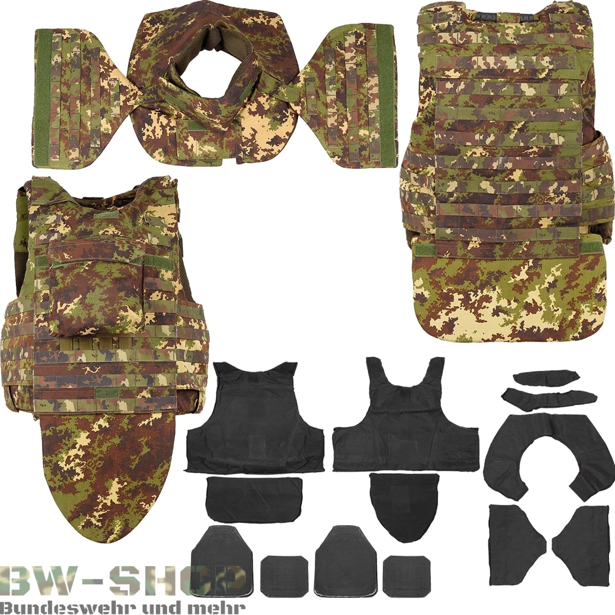 - Weste in Farbe Vegetato besitzt 4x ballistische Harteinlagen (Keramikplatten) und 7x ballistische Weicheinlagen (Kevlar)