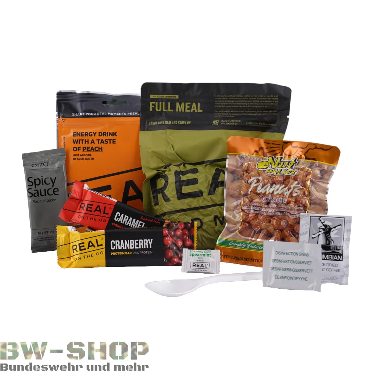 - Alle Menüs enthalten mitunter zusätzlich: Brot, Energieriegel, Kaffee, Erfrischungsgetränke, Schokolade, Löffel, Desinfektionstücher