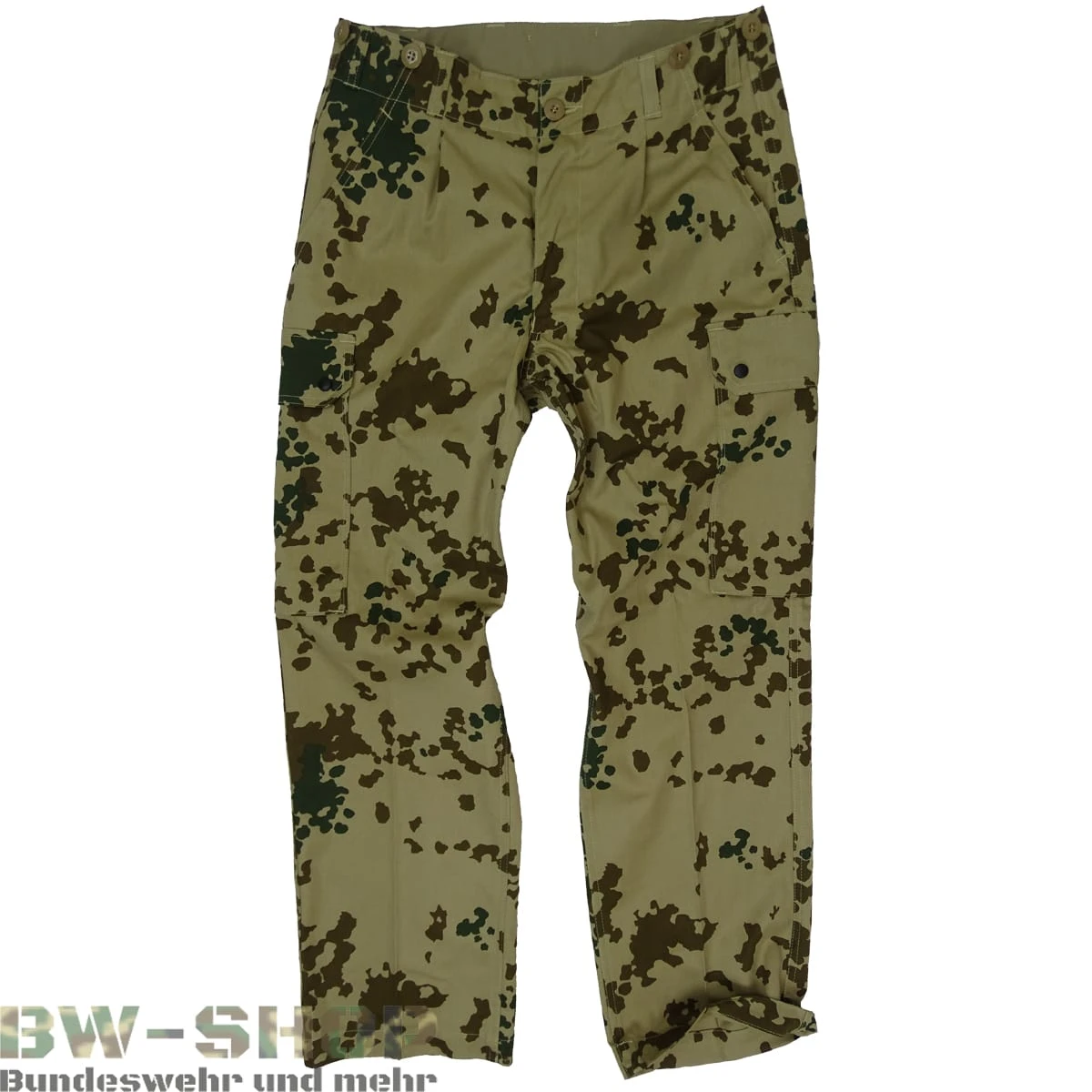 Speziell angefertigte Bundeswehr Wüstentarn Hose für heiße und trockene Gebiete deren Oberfläche meist aus Sand bestehen. Haupteinsatzgebiet in der Wüste (Afghanistan etc.). Die Hose besitzt außerdem Zugbündchen im Beinabschluss zum idealen Anpassen am Knöchel und hat eine leichtere Verarbeitung im Gegensatz zur normalen Feldhose Flecktarn.